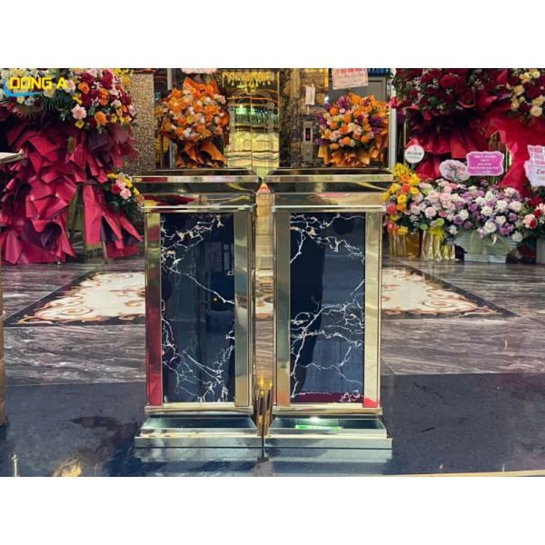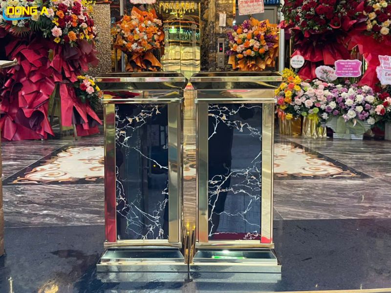Khu vực lễ tân và sảnh chờ: Thiết bị này được đặt tại đây như một vật trang trí, nâng cao ấn tượng ban đầu và sự chuyên nghiệp của công ty. Thùng rác sảnh mạ vàng ốp đá đồng bộ với nội thất cao cấp của tòa nhà.