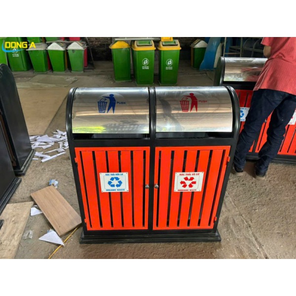 - Chất liệu: Thân thùng rác bằng thép phun sơn tĩnh điện bao xung quanh thùng bằng các nan nhựa gỗ, Nắp thùng rác bằng inox.