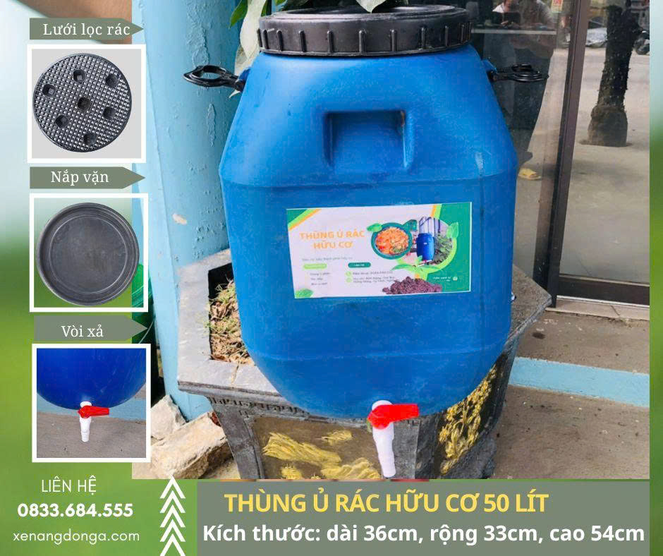 Thùng ủ phân 50 lít được làm từ phi nhựa cũ, giúp giảm thiểu rác thải nhựa. Ngoài ra, sử dụng thùng rác ủ phân để tận dụng các rác thải hữu cơ sẵn tạo thành phân bón cho cây, giúp hạn chế tình trạng chôn lấp hoặc đốt rác, từ đó giảm thiểu ô nhiễm không khí và đất.
